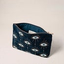 The piece is dreamt up from sumptuous ink-blue velvet and adorned with hand-illustrated mystical eye motifs, embodying ancient symbols of protection. Perfectly sized to store your daily essentials, the bag is ideal for organising your handbag or doubling as a chic clutch, complete with a gold-toned zip to sign off the look.