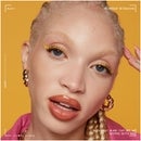 Image 3 - A close-up portrait of a smiling person with short curly hair and a nose ring, wearing bright yellow eyeshadow and displaying perfect white teeth against a yellow background, with visible text that reads BUTTERMELT GLAZE TINT SPF 30 NUTMEG BUTTA 08 and other branding information.